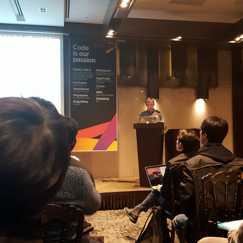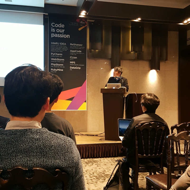 JetBrains team이 도쿄, 서울, 베이징을 돌면서 진행하는 행사에 다녀왔습니다. 프로젝트에서 JetBrains의 IntelliJ IDEA를 쓰고 있고, Kotlin에 대한 관심도 있어서 행사 알림과 동시에 신청하여 다녀왔습니다. 다소 늦은 시간에 진행되는 행사였지만 많은 사람들이 참석했습니다. 한국 행사를 주최한 ‘단군소프트’는 참석 신청자가 많아서 장소도 더 넓은 곳으로 옮겼다고 하더군요. 동시 통역으로 진행되어 언어에 대한 큰 불편함은 없었는데 JetBrains 발표자인 Hadi님이 무지 빠르게 진행해서 통역사 분이 소화를 못하더군요. (짧은 영어지만 통역기를 안쓰는 편이 이해하기 좋았다.) 운영의 미숙함(?)과 짧은 발표시간으로 빠르게 진행된 것을 빼면 많은 것을 배운 행사였습니다.