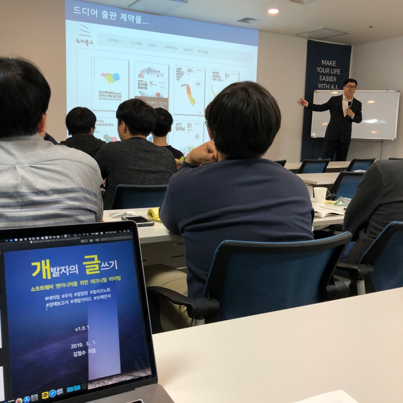 글쓰기에 대해서 관심이 많은데 페이스북에서 ‘개발자 글쓰기’에 대한 책을 PDF로 공개한 분이 있었다. 시장 수요가 많지 않는 내용이라고 출판을 거절당해서 직접 SNS에 공개한 것이다. 그런데 오늘 사내 특강에 이분이 오셨다. 2시간짜리 짧은 강연이라 글쓰기에 대해서 훑고 지나갔는데 기회가 된다면 더 상세한 강의를 듣고 싶다.