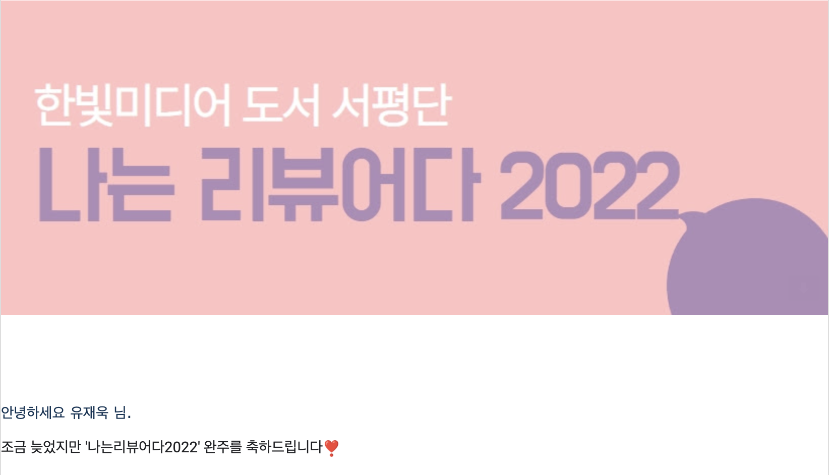 2022년도에 11권의 도서를 제공받아서 10개의 리뷰를 작성했습니다. (너무 바빴던 한 달은 작성하지 못했네요.) 그 중 하나의 리뷰는 우수 리뷰로 선정되기도 했습니다. 책을 읽고 정리하는 속도도 점점 빨라지고, 글을 쓰는 것도 조금씩 나아지고 있는 것 같습니다. 부담은 되지만 장점이 많아 2023년도에도 신청했고 다행이 선정되어 또 읽고, 쓰고 있습니다.